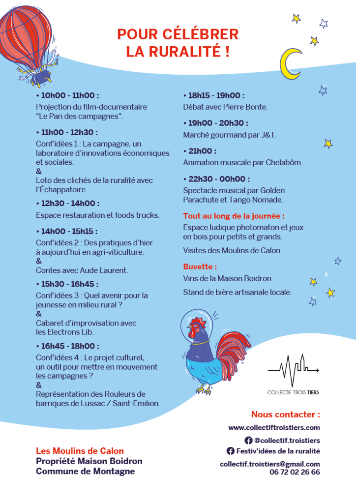 Après quelques péripéties, les festiv’idées de la ruralité auront bien lieu, dans le respect des gestes barrières et du protocole sanitaire bien établi. Rendez-vous au Moulin de Calon à Montagne pour cette première édition des festiv’idées de la ruralité.