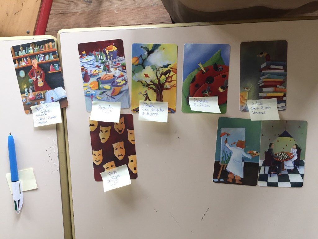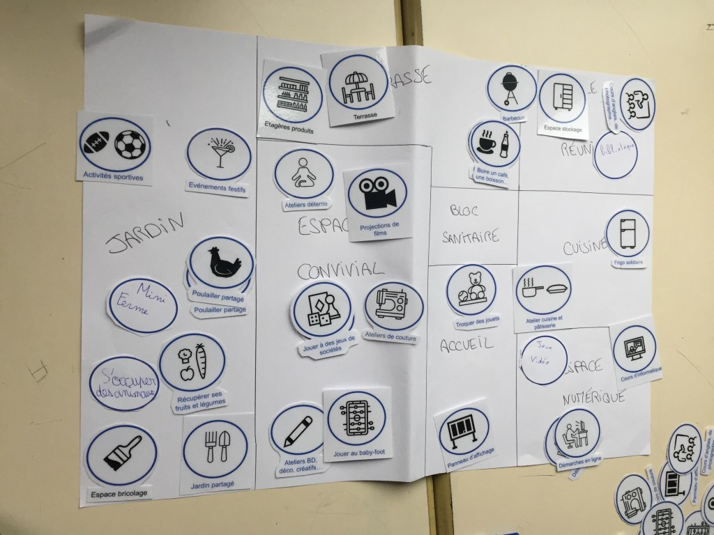 Le premier temps d’ateliers organisés en décembre a consisté à recenser et hiérarchiser les activités que les collégiens préféraient avoir dans le lieu. Il s’agissait de demander aux élèves de placer les pictogrammes d’activités dans les différentes pièces du local représentées sur un schéma (voir la figure 2). A partir de ces activités, nous avons établi deux scénarios d’aménagements qui ont été soumis aux élèves lors du deuxième temps d’ateliers, en février 2021. En effet, les collégiens ont choisi les scénarios d’aménagements et quelques photos pour illustrer les ambiances d’aménagement du tiers lieu (Voir la figure 3). Ils étaient également amenés à s’imaginer une journée dans le futur tiers lieu puis nous la raconter à travers les cartes du jeu Dixit (Voir la figure 4).