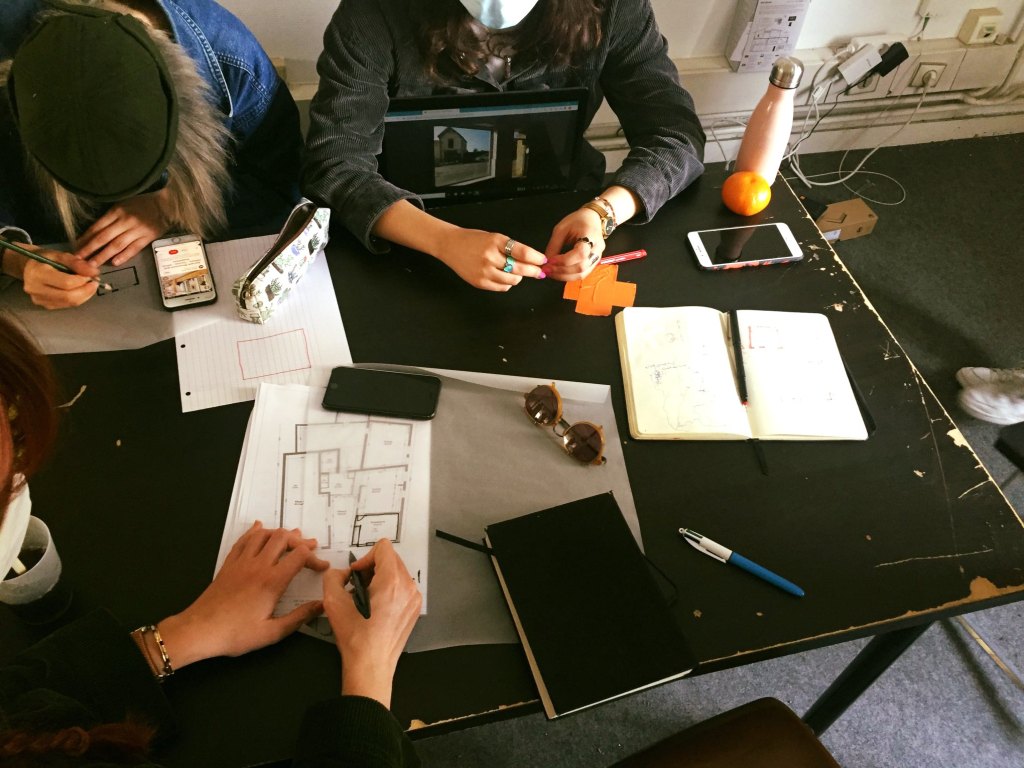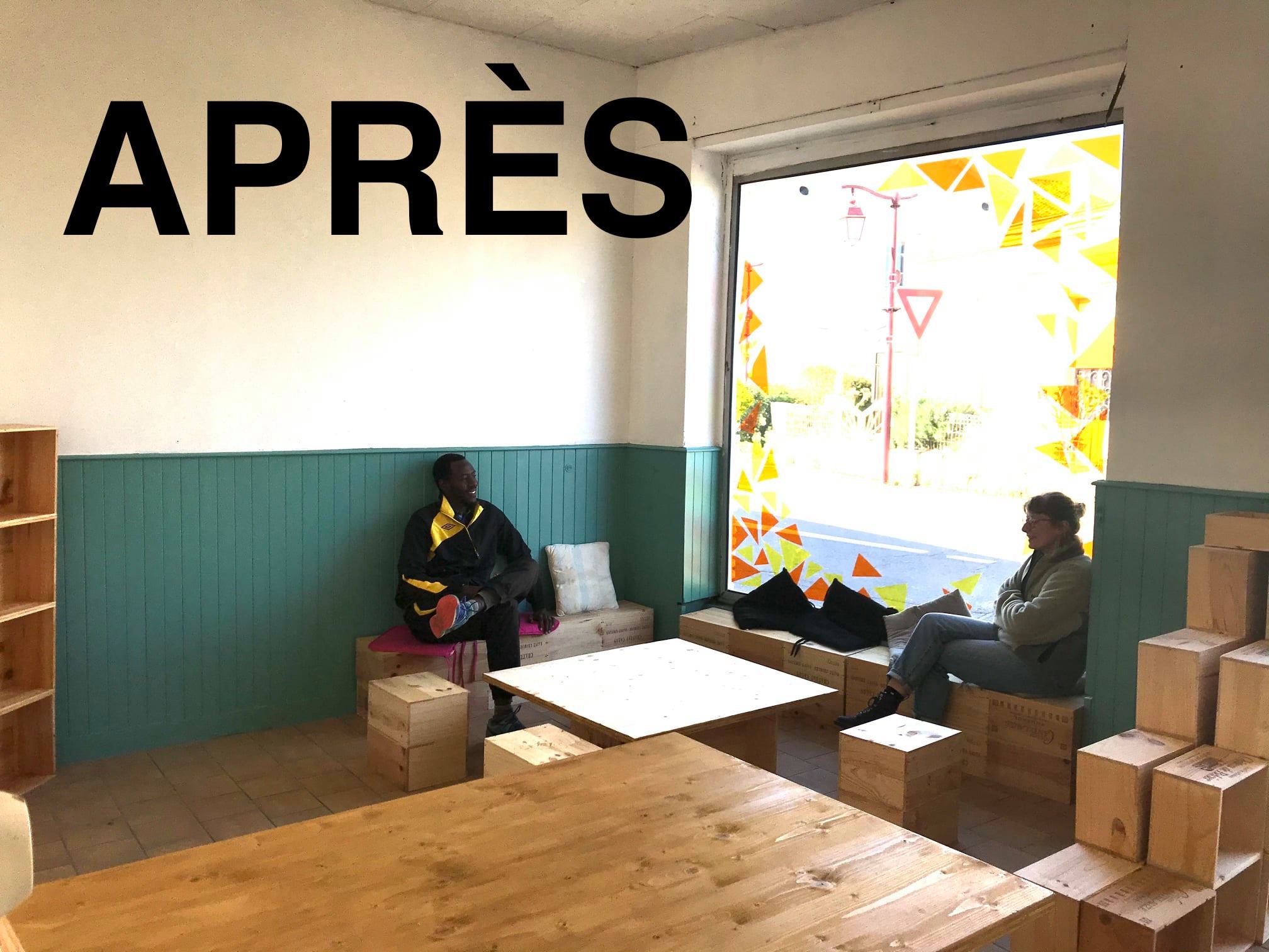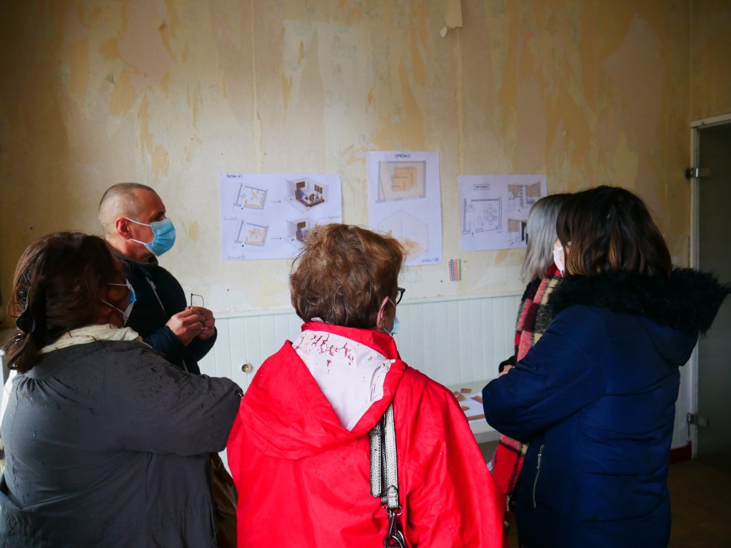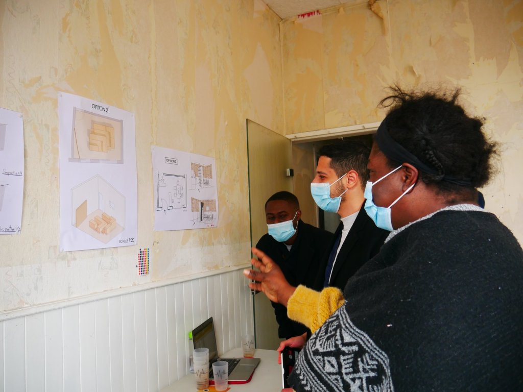 Huit étudiants répondent à notre appel à candidatures et nous font part de leur enthousiasme pour le projet ; nous décidons alors de les réunir tous ensemble sur une réflexion commune puisque « l’union fait la force » et que l’intelligence collective est l’un des maîtres-mot du Collectif ! Les semaines suivantes sont l’occasion de déplacements et réunions pour s’imprégner du lieu et proposer des scénarios d’aménagement aux habitants afin de préparer le terrain pour un premier atelier, le samedi 13 mars. Cet atelier est l’occasion de recueillir l’avis des habitants sur la disposition des meubles, le contenu de la vitrine et l’ambiance du lieu : ce sera du mobilier modulable, pour s’adapter à tous les usages du lieu.