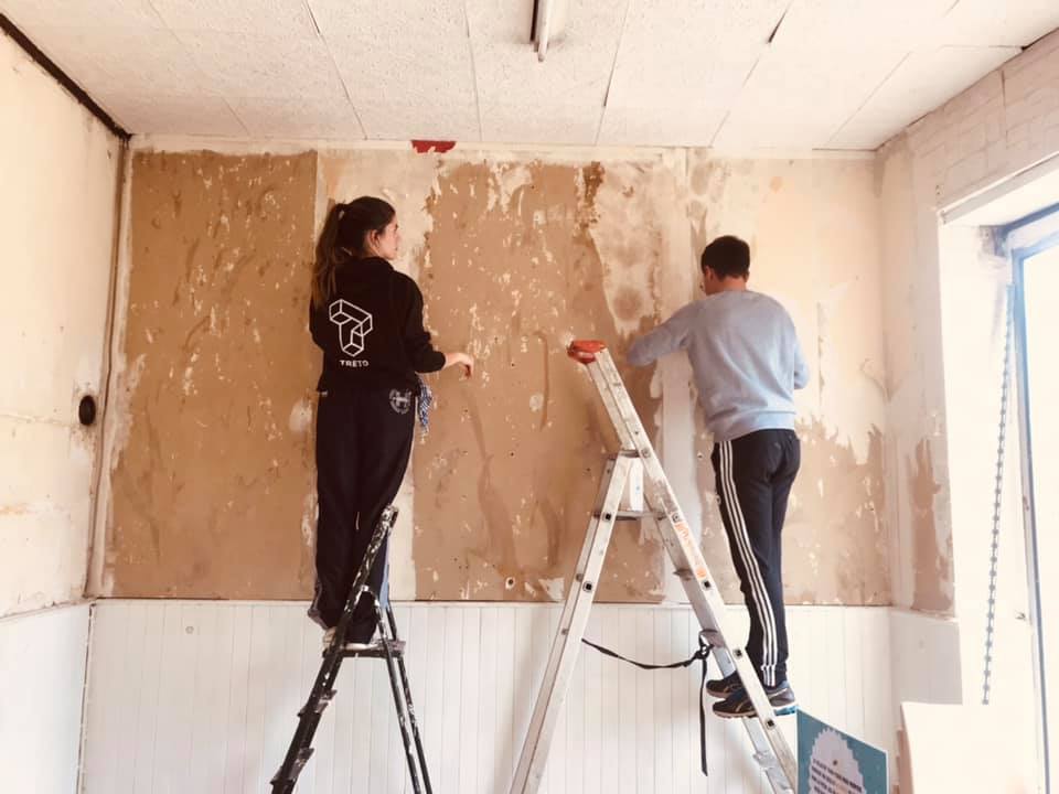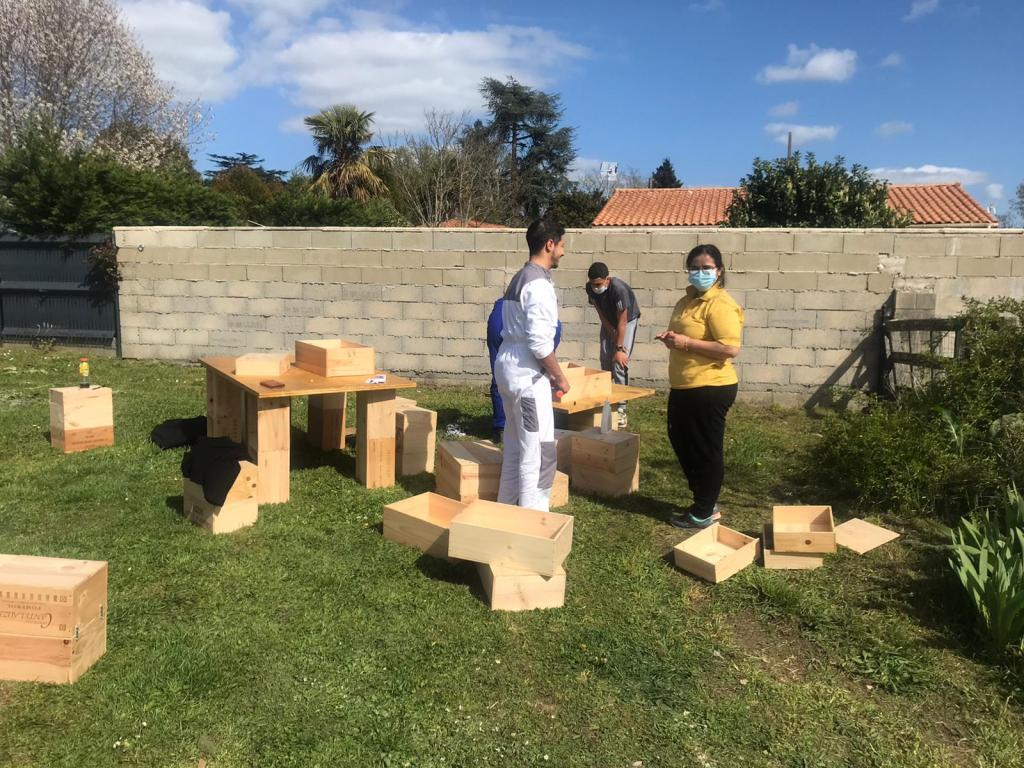Le chantier du 27 mars arrive enfin ! Une vingtaine d’habitants répondent à l’appel, en plus des étudiants et de l’équipe Trois Tiers. Les dons affluent au-delà de nos espérances et on se retrouve vite avec tous les matériaux nécessaires. Le soleil est au rendez-vous, les jeunes se lancent dans la fabrication de toilettes sèches expérimentales pendant que les moins jeunes poncent les meubles en caisses de vin nouvellement assemblés. Les papotages vont bon train (avec les masques bien sûr), des curieux pointent le bout de leur nez et finissent par rester toute l’après-midi. En parallèle, les étudiants terminent de poser la peinture bleue et blanche sur les murs de la Maison du Projet, essuyant leurs pinceaux sur le nez de leur voisin. Chacun(e) se quitte fatigué mais heureux de cette journée passée en si bonne compagnie… Nous retournerons plus tard dans la semaine fignoler la peinture, aménager le local flambant neuf et consacrer au lieu le shooting photo qu’il mérite.