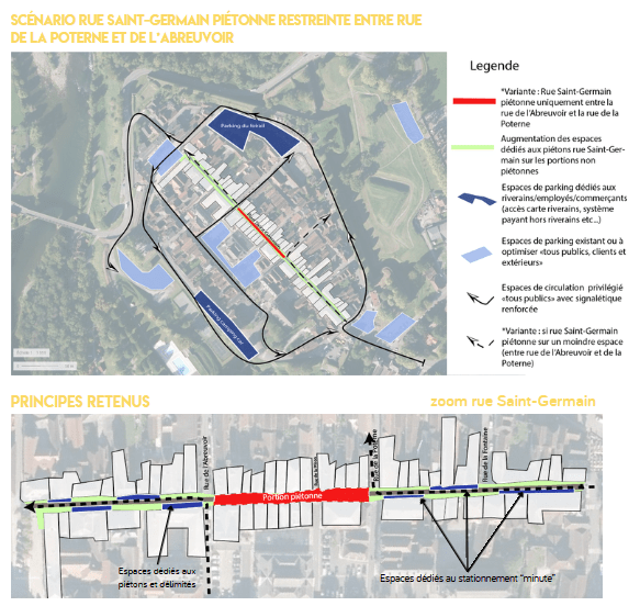 Trois questionnements sont mis en avant par le label et font également l’objet de directive issues du futur plan guide “Petite Ville de Demain” (dont la communes est également lauréate) : la réduction significative des véhicules stationnés, une amélioration de l’ambiance routière et la recherche d’un confort de l’espace public pour favoriser les modes de déplacements actifs.